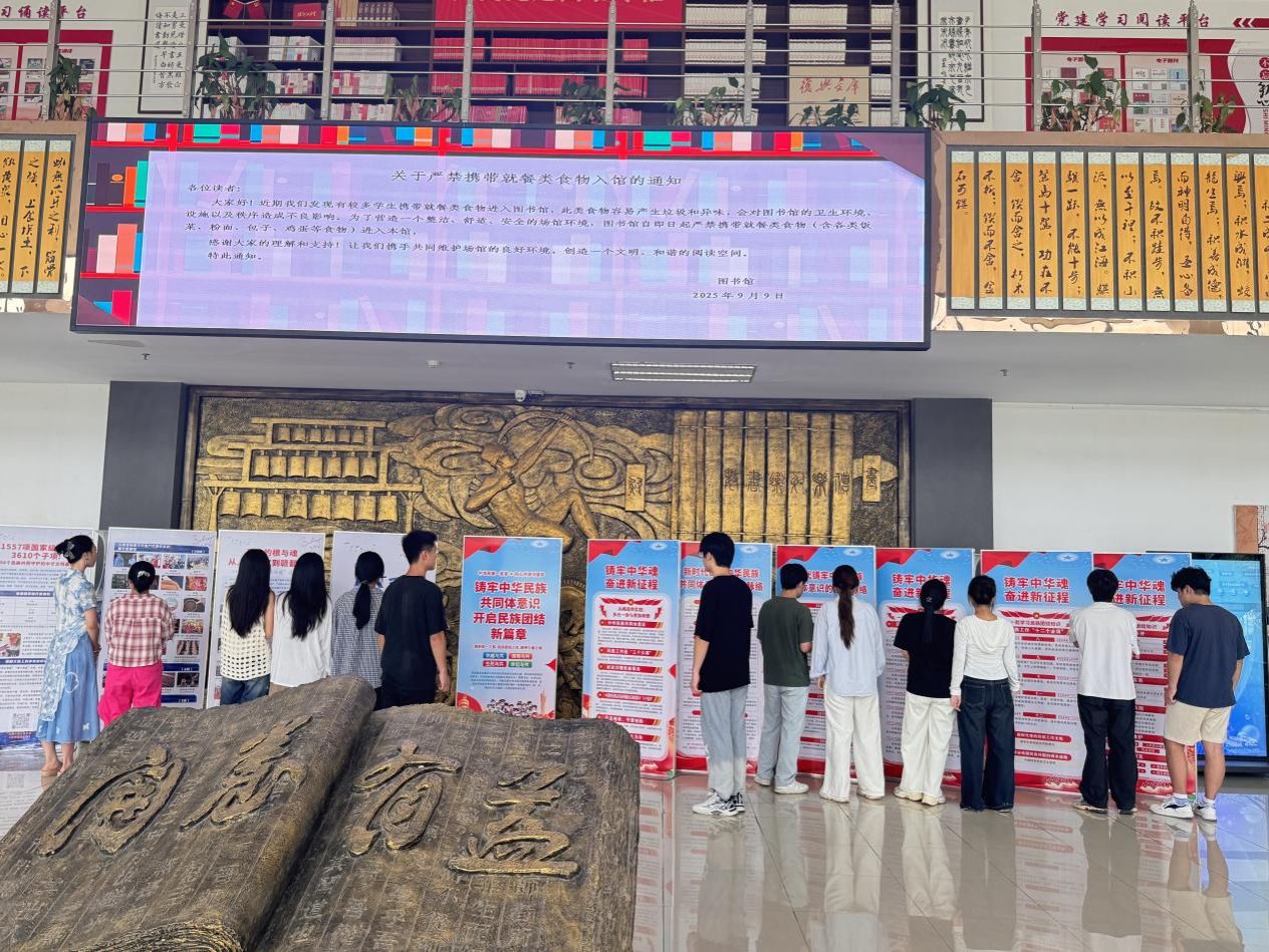 走近图书馆、教学楼,“铸牢中华魂、奋进新征程”主题展板格外醒目。学校充分利用公告栏、电子屏、楼道空间等载体,系统展示民族团结进步知识、民族政策实践、铸牢中华民族共同体意识发展脉络、非物质文化遗产与民族团结融合等内容。电子屏循环播放《同心共筑中国梦》专题片,微信公众号推送学习教育微视频,形成“抬头可见、随时可学”的浸润式育人环境,让铸牢中华民族共同体意识在潜移默化中深入人心。